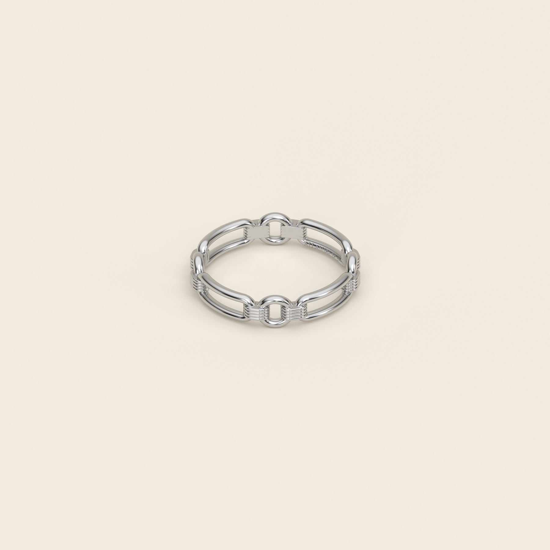 This ring is composed of four closed shen rings joined by four cartouche forms, creating a continuous linked band. Circular enclosure and elongated framing alternate evenly around the finger, establishing a balanced and deliberate geometry.