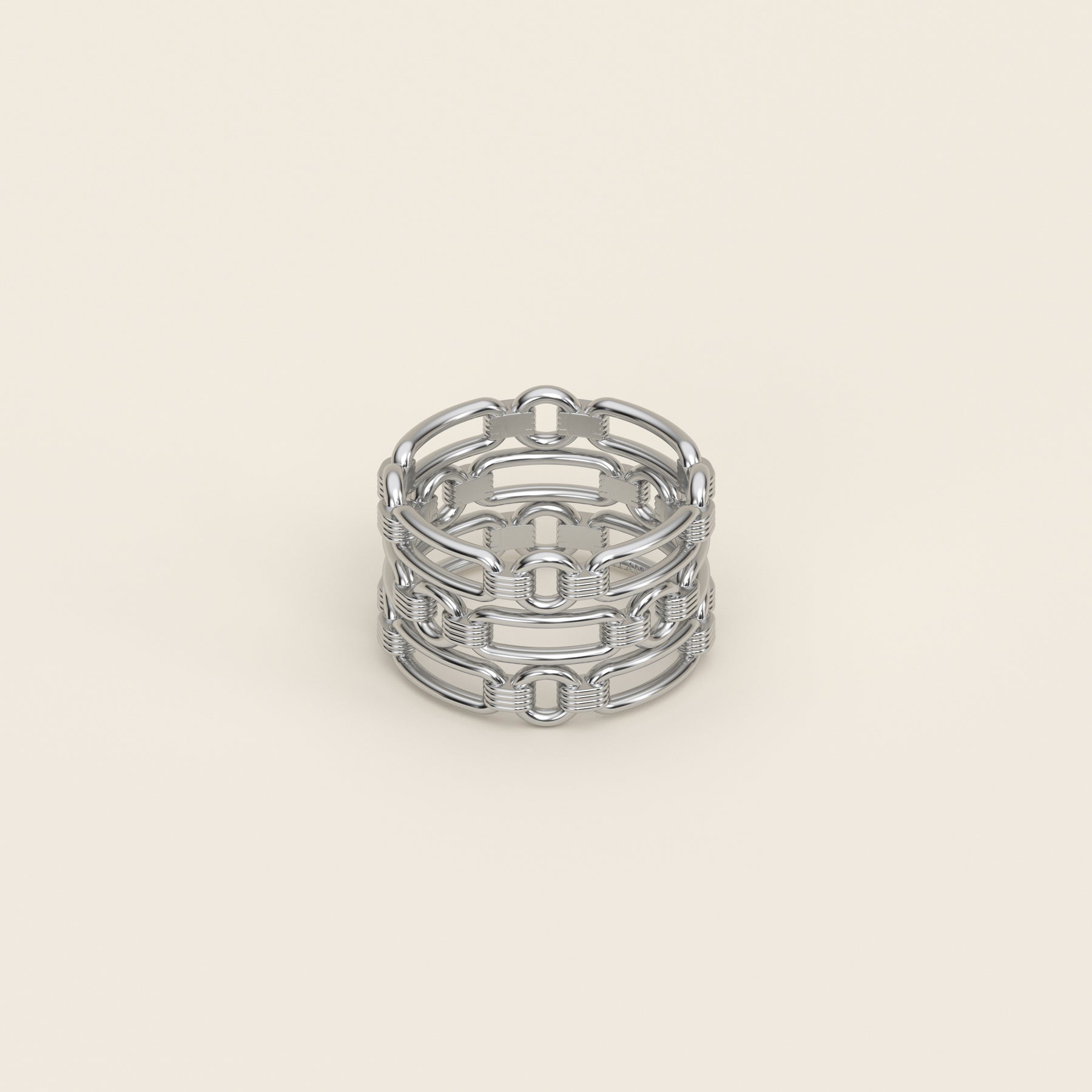 Worn on the hand, the accumulated repetition reads as continuity built through structure. The ring presents protection as something reinforced and enduring.