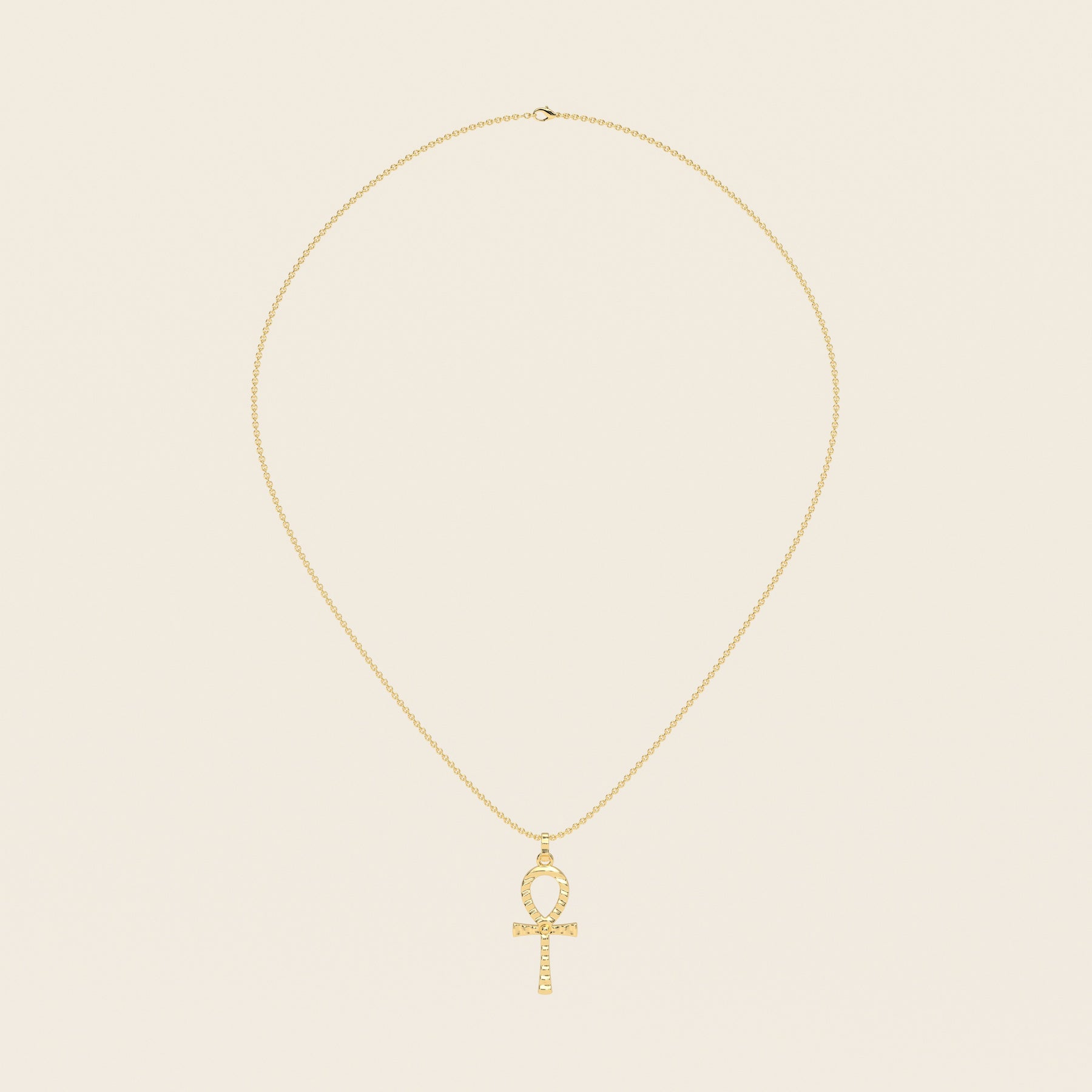 This pendant features a subtly rippled surface that introduces movement and light across the form. The underlying geometry of the Ankh remains intact, while the texture adds depth without obscuring structure.