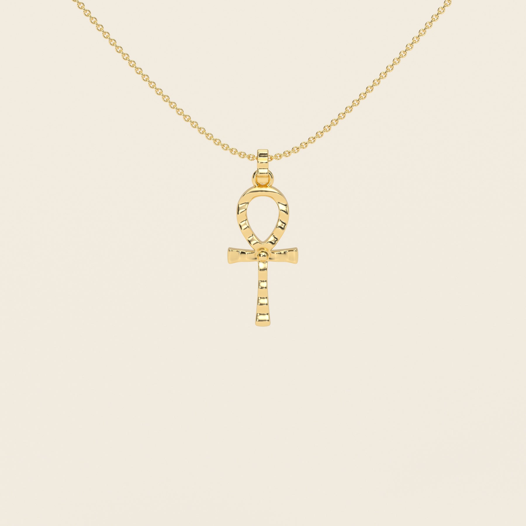 This pendant features a subtly rippled surface that introduces movement and light across the form. The underlying geometry of the Ankh remains intact, while the texture adds depth without obscuring structure.